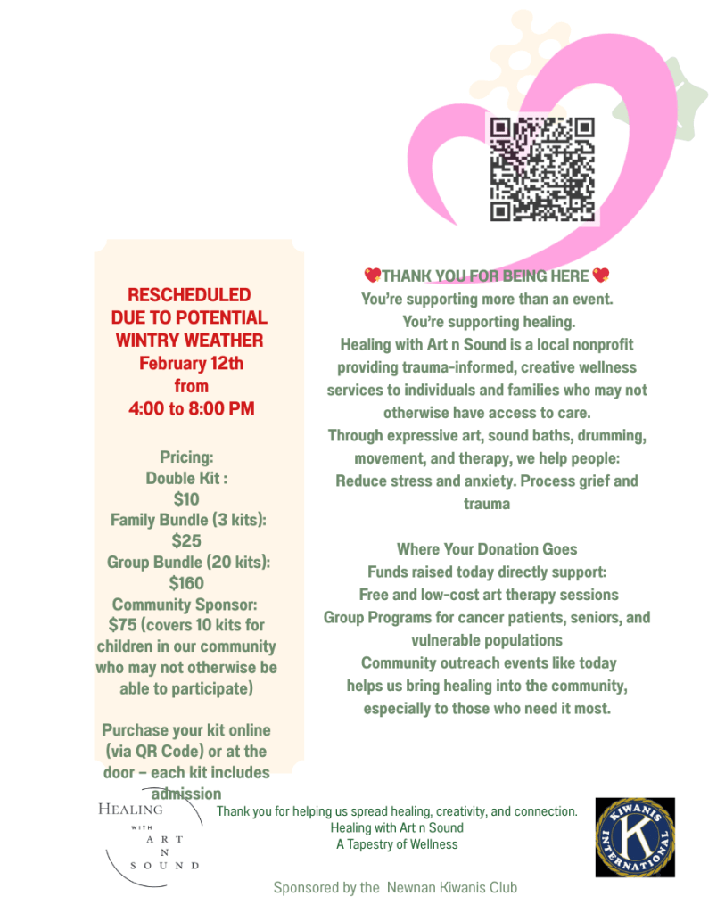 Bundle up and bring them to the Peachtree City Library for a cozy, creative afternoon of Valentine’s Day card-making with Healing with Art n Sound. Your children will get to create heartfelt Valentines for someone they love and for patients at the Piedmont Hospital Cancer Center, spreading warmth and kindness when it’s needed most.