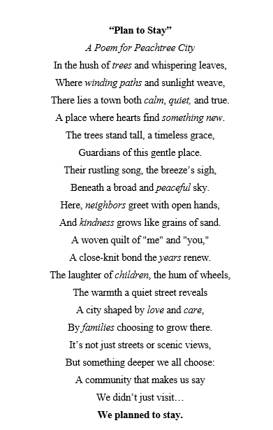 This week, we presented the finished piece, complete with parks, trails, landmarks, and plenty of golf carts to the Mayor and City of Peachtree City. Alongside the artwork, we shared a poem titled “Plan to Stay”, created from the 36 most meaningful words submitted by residents, capturing the heart of what “home” means here: Trees, Winding paths, Calm, Quiet, New, Peaceful, Neighbors, Kindness, Years, Children, Love, Care, Families, Safety, Community, Golf Carts, Paths, Friendship, Open Space, Greenery, Parks, Schools, Events, Nature, Home, Tranquil, Support, Future, Together, Memories, Spirit, Growth, Beauty, Freedom, Belonging, and Serenity.