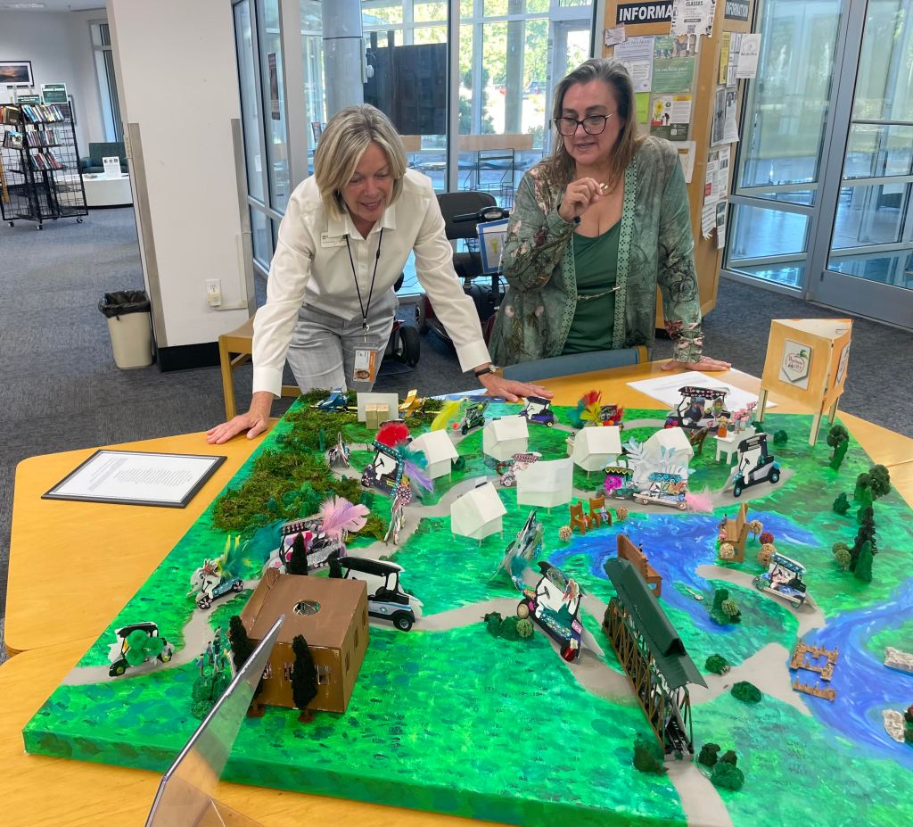 During the festival, more than 250 families stopped by our “Plan to Stay” community art space to decorate tiny 2” golf carts with words and images that expressed what they love most about living in Peachtree City. Those decorated carts, symbols of connection, gratitude, and creativity, became the foundation for something bigger: a three-dimensional diorama of Peachtree City that celebrates the places, people, and values that make this community special.