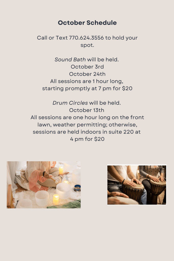 Welcome to our Events Page! Here, you’ll find all the details about our upcoming sound baths, drum circles, expressive art workshops, and other holistic therapy events designed to support your healing journey. Whether you’re looking to reduce stress, find peace, or reconnect with yourself, our events offer a safe and compassionate space to nurture your mind, body, and spirit. We look forward to sharing these transformative experiences with you!
