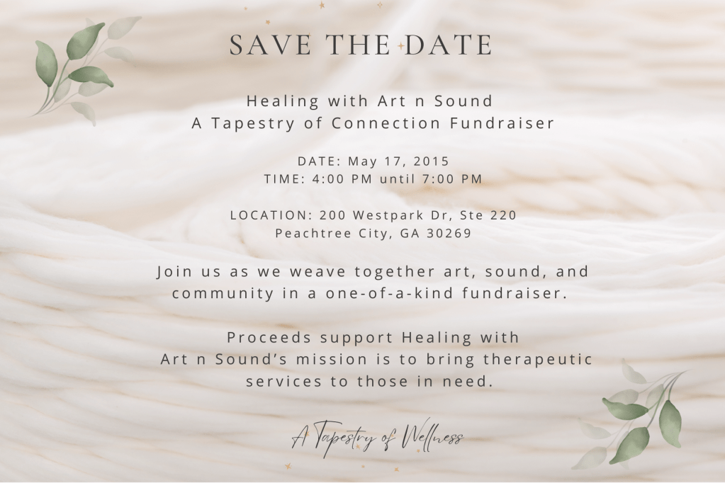 We’re thrilled to invite you to Healing with Art n Sound’s A Tapestry of Connection Fundraiser on May 17, 2025, from 4:00 PM – 7:00 PM in Peachtree City, GA!